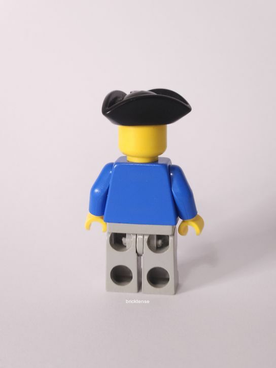 Minifigurka pirata z serii niebieskich koszul z szarymi spodniami i czarną, trójkątną czapką (trikorn). Głowa z czarną opaską na prawym oku i czarnymi włosami.
