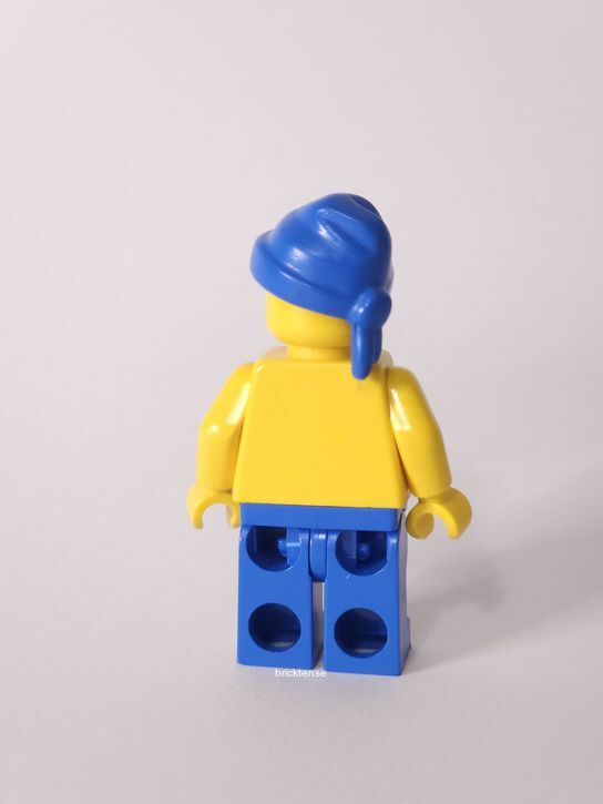 Minifigurka pirata z serii żółtych z niebieskimi spodniami, koszulką w biało-czerwone pasy i niebieską chustą (bandana). Głowa z wąsami i czarnymi, rozwianymi włosami.
